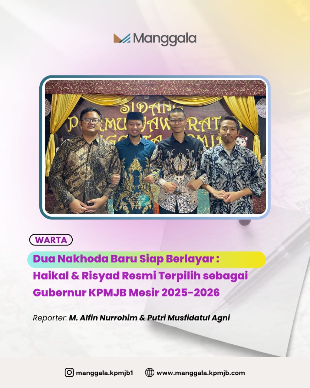 Manggala, Kairo – Di tengah suasana khidmat Sidang Permusyawaratan Anggota (SPA) KPMJB 2025 pada Senin (11/8) di Aula Pasanggrahan KPMJB Mesir, Kairo, tongkat estafet kepemimpinan resmi berpindah tangan. Achmad Haikal Al-Mubarok (Oded) dan Risyad Abdul Hakim terpilih sebagai Gubernur dan Wakil Gubernur KPMJB. Keduanya siap mengarungi masa bakti baru dengan membawa semangat kebersamaan dan langkah-langkah inovatif untuk menghidupkan dinamika KPMJB.